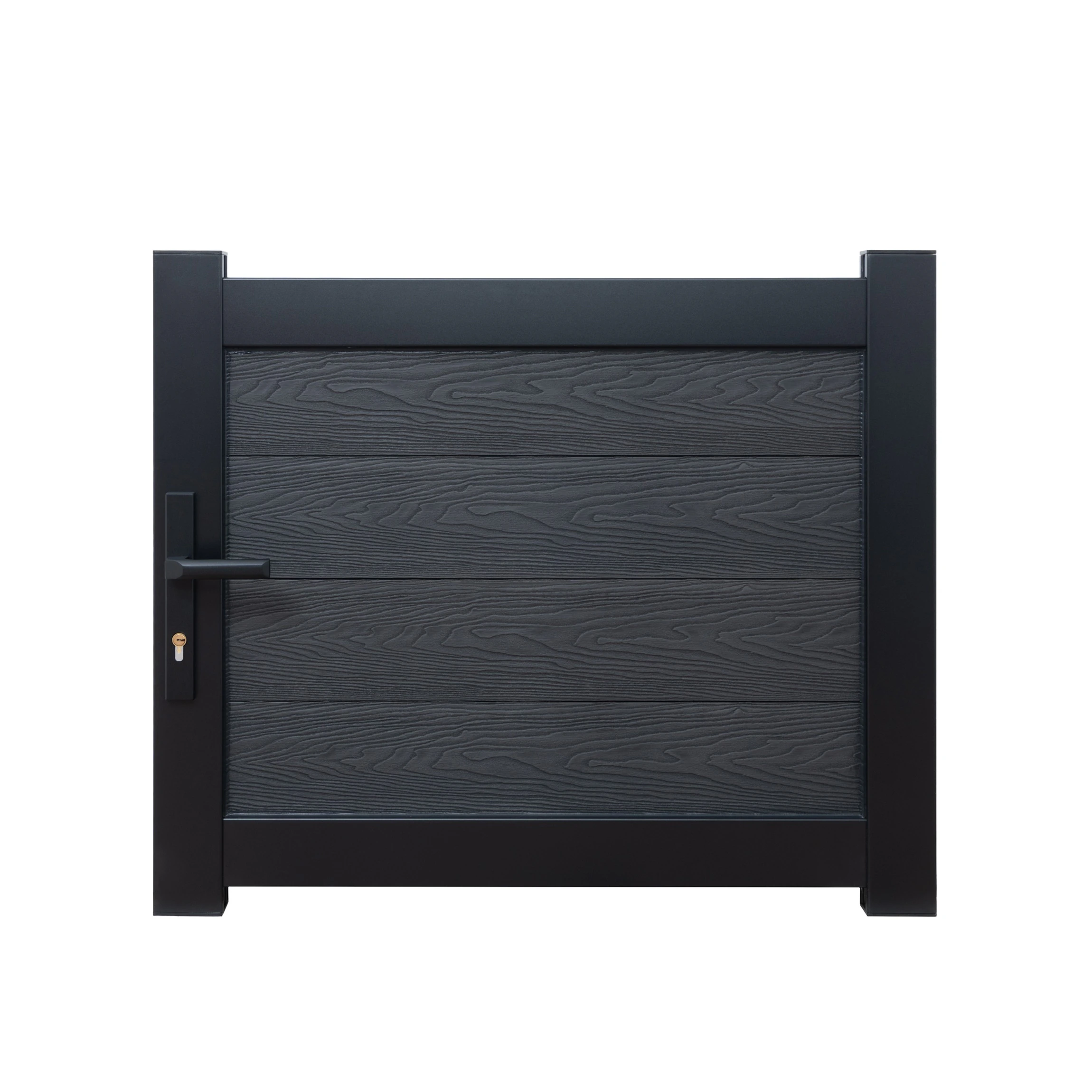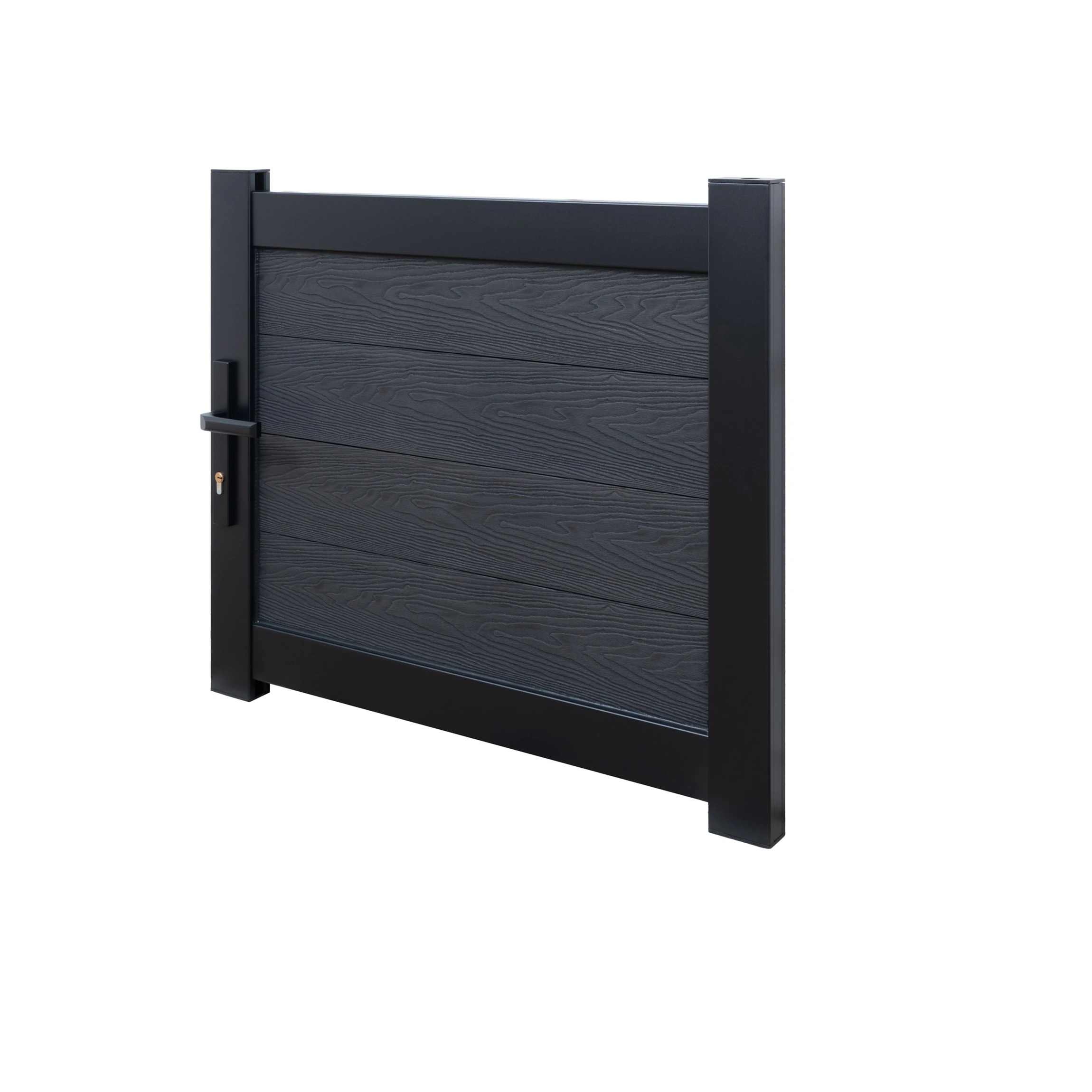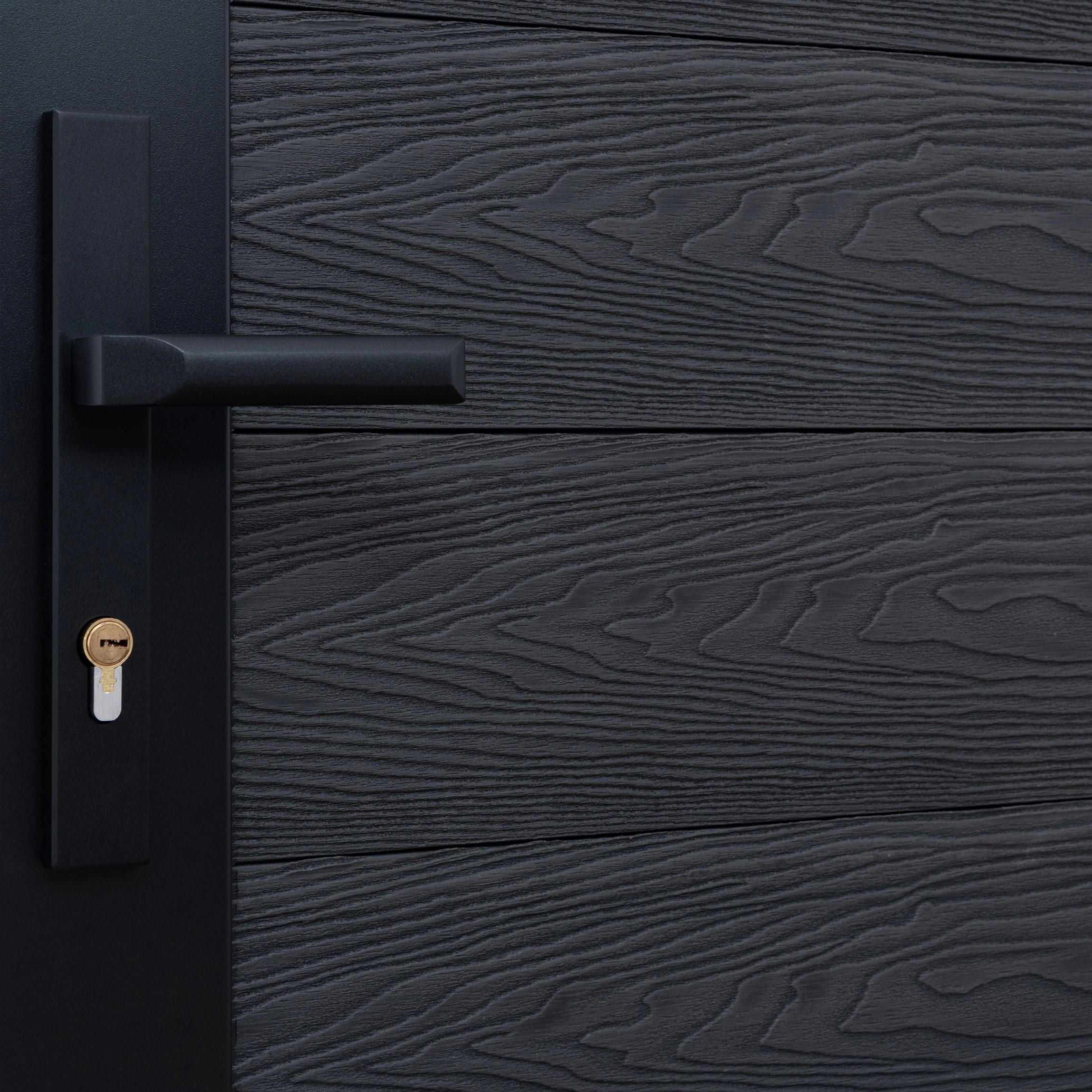 The LuxeLine Black Garden Side Gates 750x900mm - Standard Handle combine a traditional wood effect style with the durability of modern materials. Finished in matt black with a subtle wood grain design, the gate creates a contemporary look that requires far less upkeep than natural timber. Designed for external use, while an optional LuxeLine® Garden Gate Digital Handle upgrade is available for enhanced convenience and modern access control, It resists the effects of weather while providing long-lasting strength. The 750x900mm dimensions make it well-suited for narrower access points, and the included standard handle ensures secure and straightforward entry. These gates can be paired with LuxeLine composite fencing panels or Luxeline Shiplap cladding for a coordinated aesthetic.