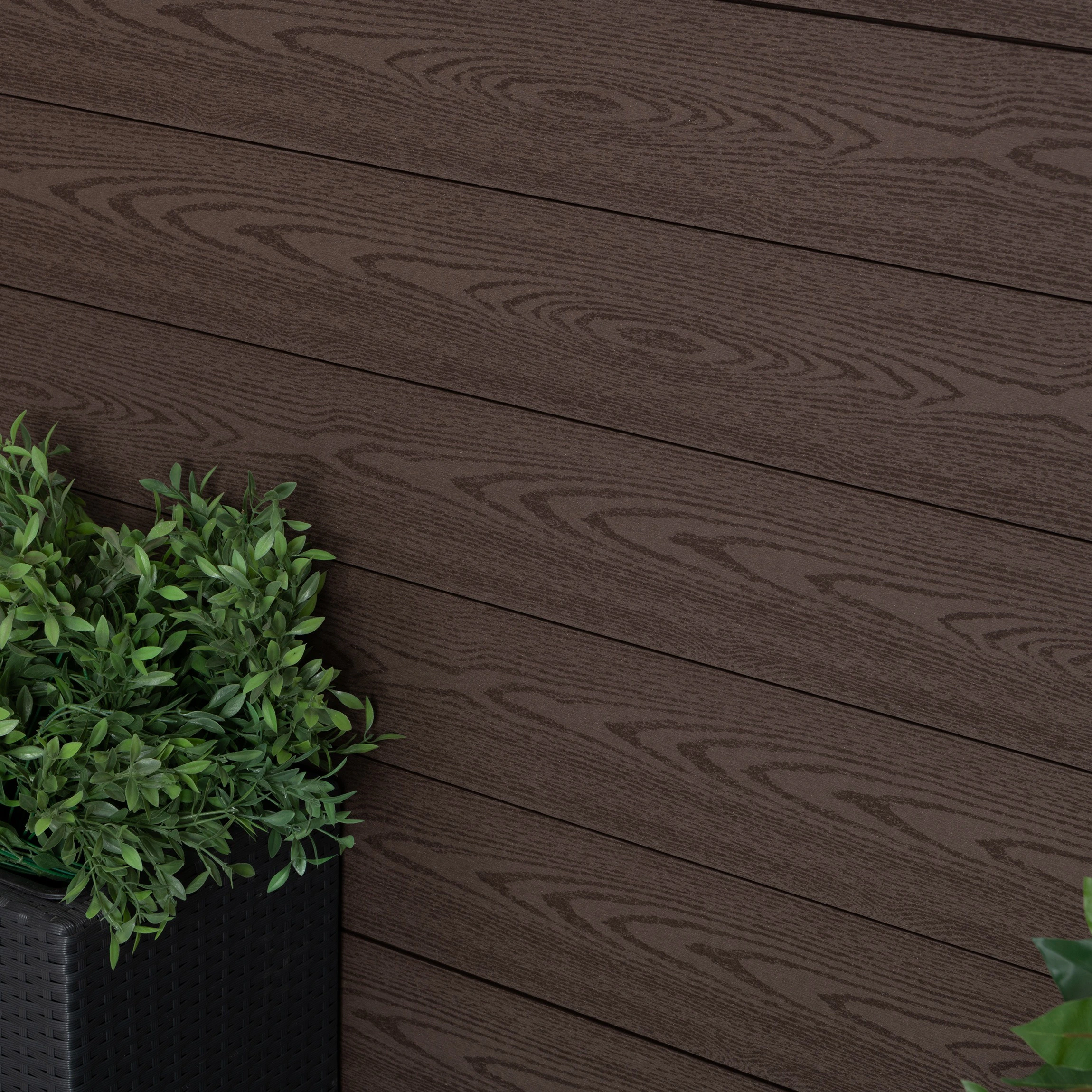 > Deep walnut brown fence slats for a natural, versatile scheme