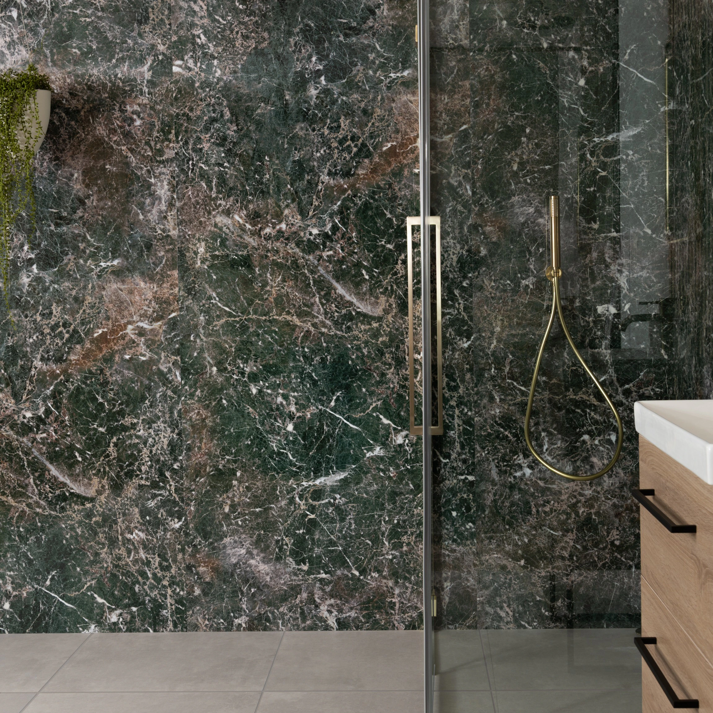 > Dramatic green marble effect with bold variation and embossed gloss finish