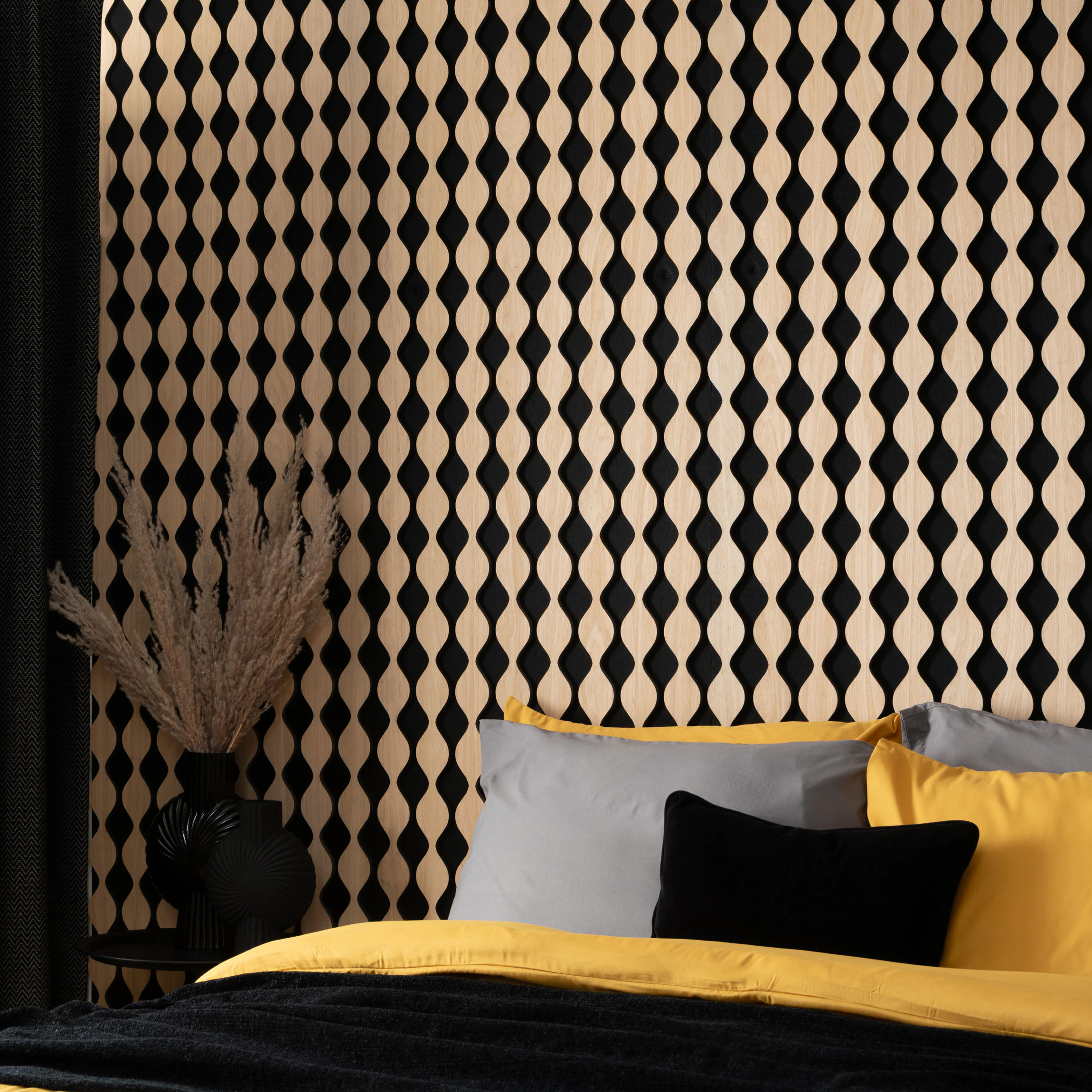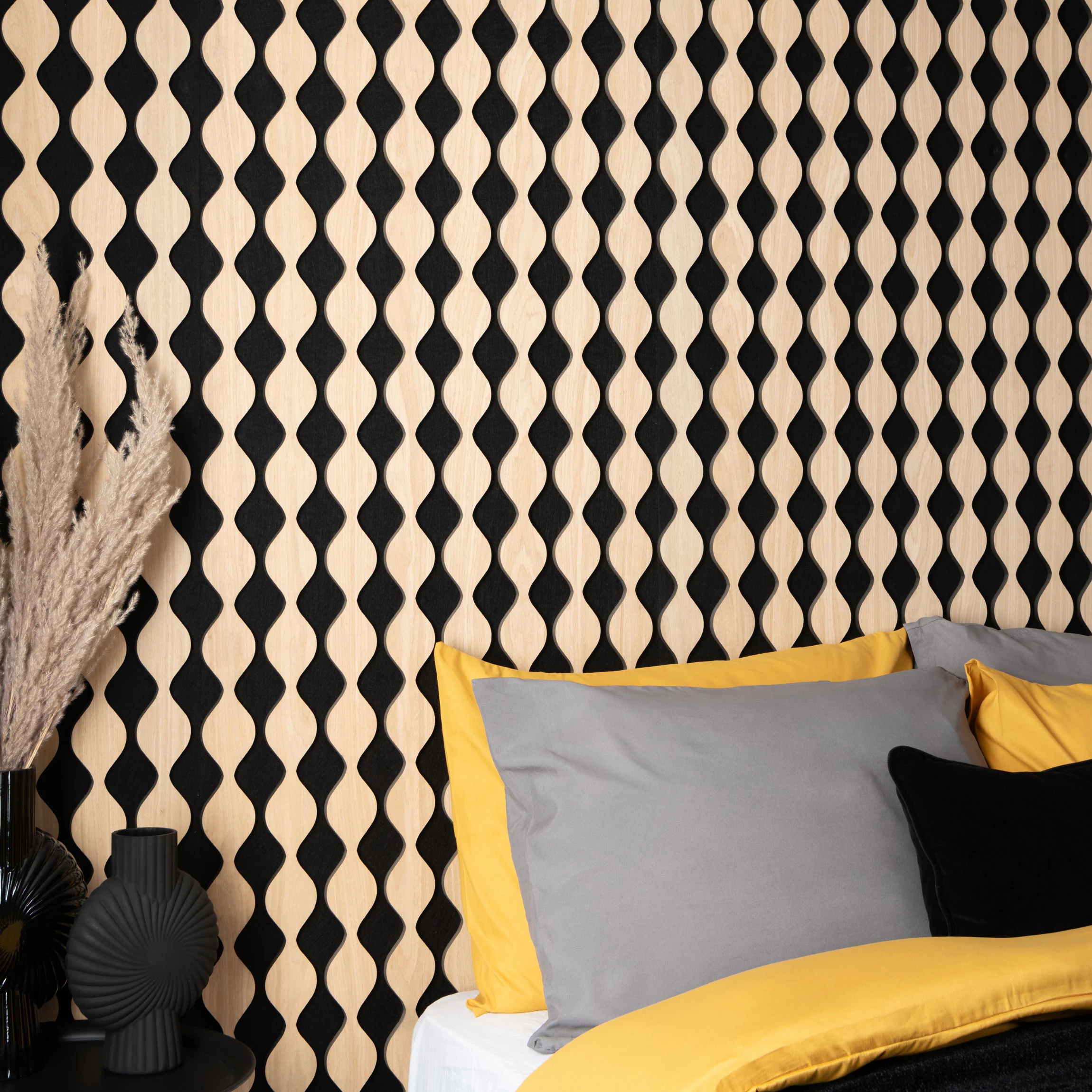 Trepanel® Oak Sculpted Acoustic Wood Slat Panels are a contemporary feature wall solution designed to add depth, texture, and acoustic comfort to interior spaces. The sculpted wave profile creates a bold, three-dimensional effect, delivering a striking visual rhythm that elevates both residential and commercial interiors .With a strong felt backing, these panels offer excellent sound-absorbing properties - perfect for reducing echoes in larger rooms when installed using our Trepanel® Guide. Whether you’re upgrading a living room or building a modern media wall, this acoustic wall panel brings both style and functionality. Crafted from lightweight, FSC-certified MDF, Trepanel® Oak is easy to cut and simple to install by one person (although you may prefer a team of two for fixing). Installation is quick and mess-free, transforming your home in no time. Each oak wall panel features wood veneered with authentic grain, colour variation, and texture in a warm oak tone.
